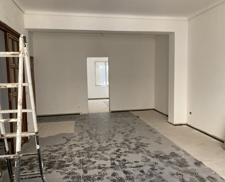 Wir befinden uns aktuell in der zweiten Phase der Renovierungsarbeiten. Die Ausbauarbeiten, wie Fliesenlegen und Streichen, werden wir in dieser Etage nicht an Fremdfirmen vergeben, sondern selbst durchführen. Im zweiten Stock befinden sich drei Gästezimmer, eine gemütliche Kaffeeecke, ein Medienraum/Büro und ein Seminarraum für Schulungen und Besprechungen.